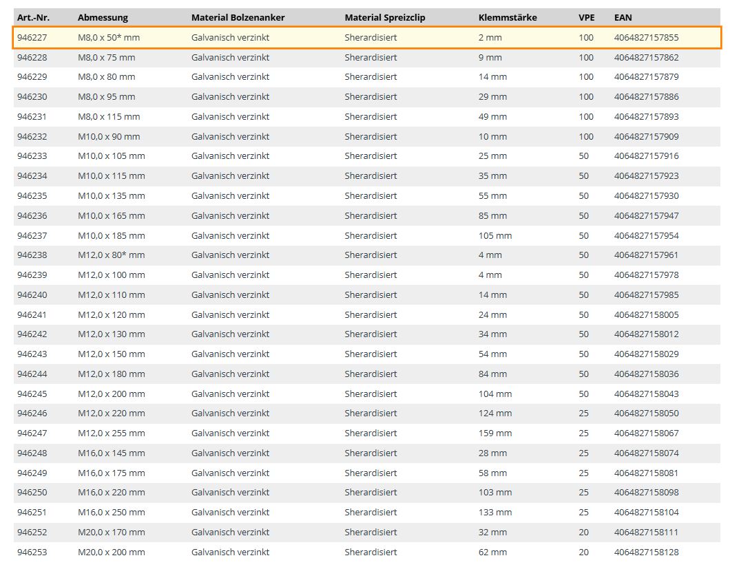 *Für die gekennzeichneten Ausführungen ist momentan keine ETA-Zertifizierung vorhanden (siehe Artikeltabelle).