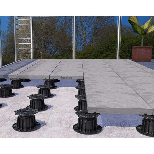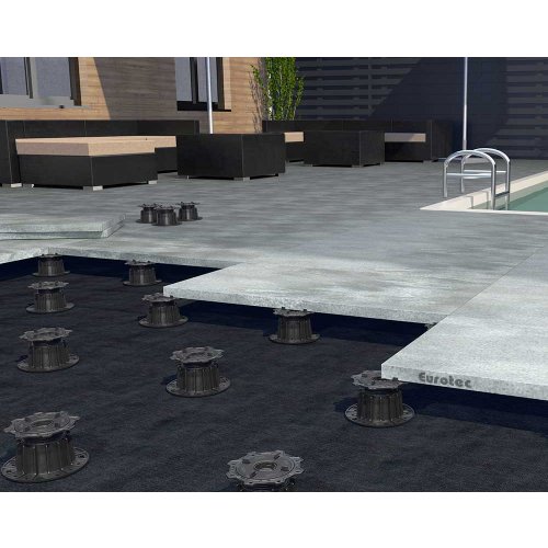 Die Verstellfüße GIANT von Eurotec eignen sich gezielt für die Einzelauflagerung von schweren, großformatigen Steinplatten oder Keramikfliesen. Die Reihe hat vier Varianten zu bieten, welche alle über einen stufenlos justierbaren Bereich von 40 bis 220 mm verfügen. Die Aufbauhöhe lässt sich mit dem Erweiterungsring GIANT um weitere 170 mm erhöhen.